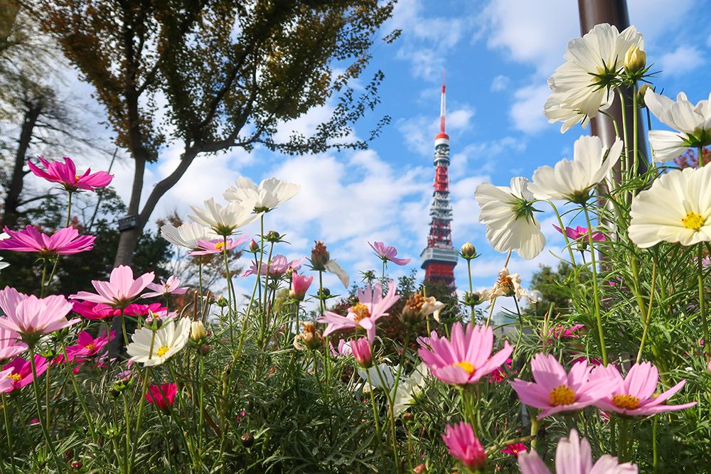 A beautiful sight of dainty cosmos and Tokyo Tower