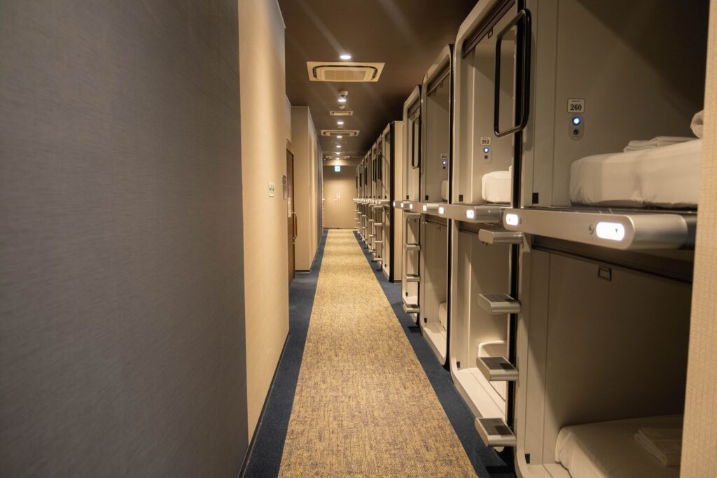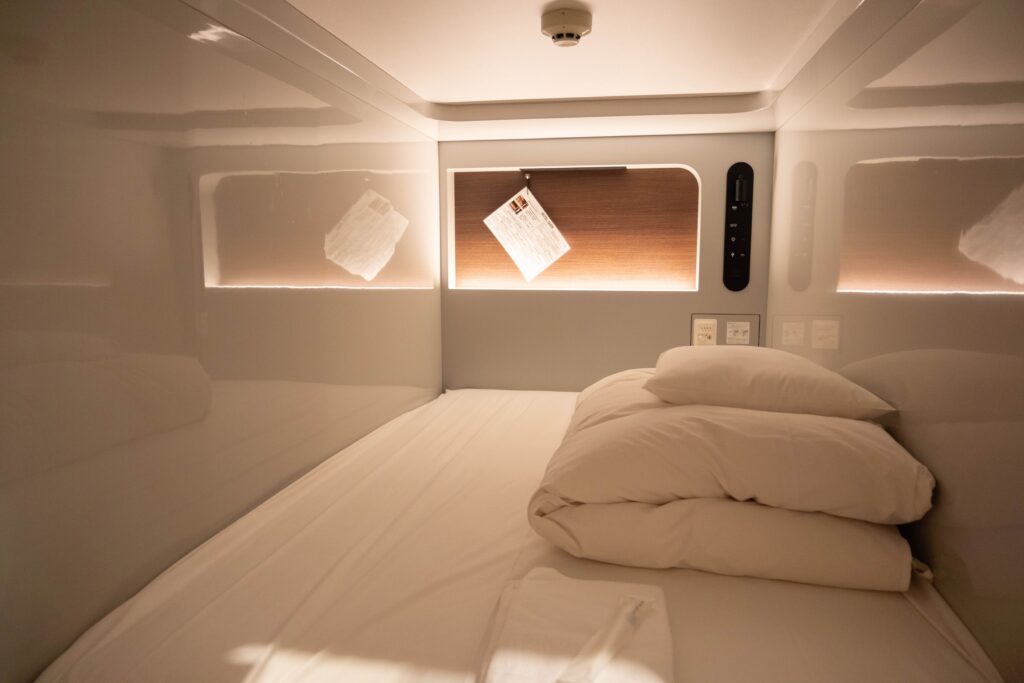 The rooms here are designed in a cabin style, offering a simple, elegant, and minimalist approach to comfort. Each capsule provides a private sleeping space with pillows, blankets, a lamp, and a safe at the head of the bed.