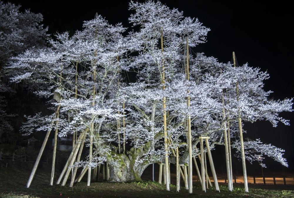 This sakura tree is located in Sumiyoshi Park, Motosu, Gifu Prefecture. It is estimated that the age of the tree is more than 1,500 years. At a height of 16.3 meters, when the tree is in full bloom the flowers appear white. When the flowers have reached their peak and are ready to fall, they appear light gray (usuzumi = light ink).