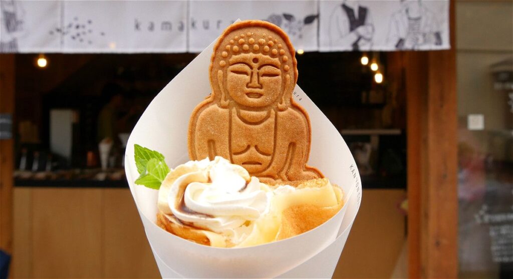 After shopping for souvenirs, you will reach an intersection where you’ll find a super cute coffee shop called Kannon Coffee. Since opening in 2017, it has become famous for its delicious crepes that come topped with a handmade Buddha cookie!