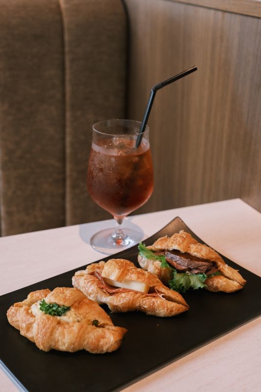 One of the standout menu items is the Slider Croissant Sandwiches—a set of three croissant sandwiches, each about two-thirds the size of a regular croissant. You can choose from a selection of flavors, and we recommend the Black Truffle Egg, Spanish Ham with Comté Cheese, and Roast Beef. These sliders allow you to savor a variety of tastes while enjoying the beautiful, serene setting of the cafe.