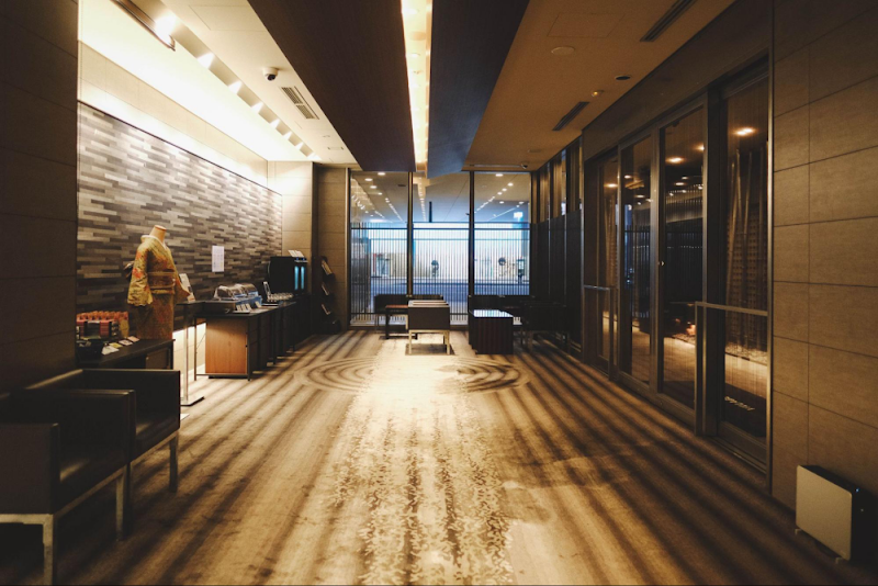 Look down, and you’ll notice the carpet design subtly echoes the raked sand patterns of a rock garden, gently easing your mind into “Kyoto mode” the moment you step inside.