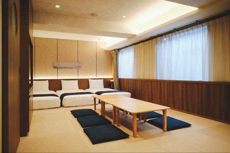 “SAKURA” was renovated around the same time and is a 43 m² Japanese-Western style room. It includes three beds plus three sets of Japanese futons, accommodating up to six guests. Along with its luxuriously spacious layout, it also features a Japanese-style lounge area by the window—making it a dream setup for families and groups.