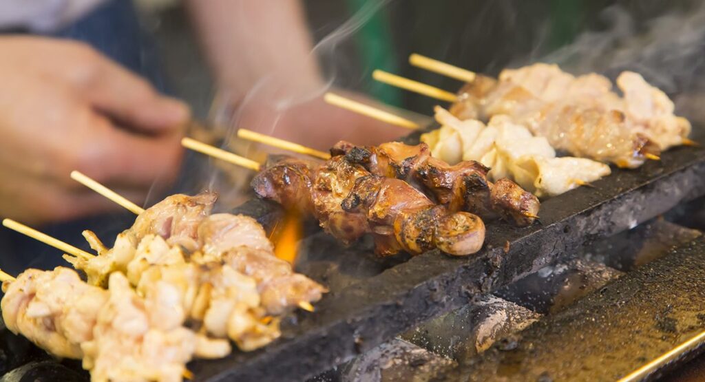 The meat is usually cut in small cubes, skewered seasoned with salt and pepper or tare, depending on the cut.